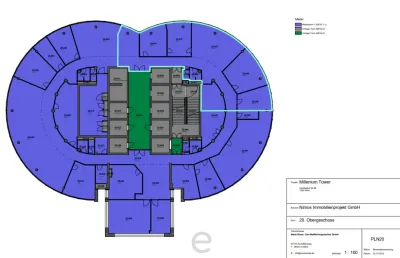 Der markante Tower erhebt sich aus einem in mehrere Teile gegliederten Flachbau. Darin gibt es für Mieter und Besucher ein großes Angebot an Einkaufsmöglichkeiten, Dienstleistungen, Gastronomie und Entertainment. Die sogenannte " Millennium City " ein Ort, an dem sich Arbeit und Freizeit bestens verbinden lässt. Der Millennium Tower macht nicht nur in der Wiener Skyline eine gute Figur, das Multifunktionsgebäude am Donauufer trägt außerdem den Titel " Blue Building ". Diese Auszeichnung von der Österreichischen Gesellschaft für nachhaltige Immobilienwirtschaft wurde dem Büroturm für sein nachhaltiges Energiekonzept aber auch für die Raumnutzung im gesamten Gebäude verliehen. Der 20. Wiener Gemeindebezirk liegt auf einer Insel zwischen dem Donaukanal und der Donau im nordöstlichen Zentrum und zählt mit seinen etwa 85.500 Bewohnern zu den am dichtesten besiedelten Bezirken Wiens und bietet dadurch beste Vorraussetzungen für ein florierendes Business.