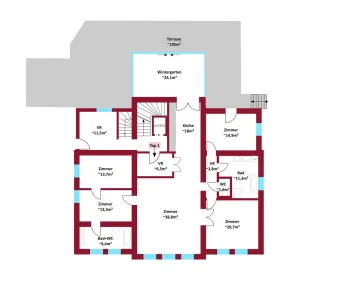 - Drei geräumige Zimmer ca. 14,85 m², 20,68 m² und 13,72 m²: Ein Zimmer mit direktem Zugang zum beheizten Wintergarten.