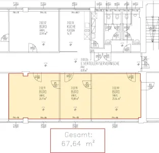 > 2.OG, Top mit 67,64 m²: 3 zentralbegehbare Büroräume, welche zusätzlich intern jeweils mit einer verschließbaren Bürotüre verbunden sind