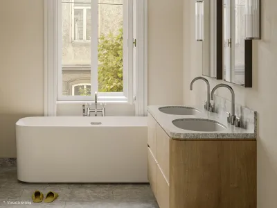 Die Badezimmer sind mit exklusiven Waschtischmöbeln mit Spiegelschränken und Leuchten ausgestattet, die Funktionalität und Ästhetik vereinen.
