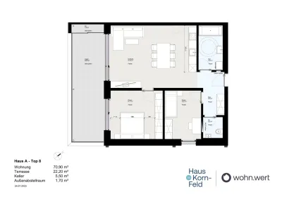 Genießen Sie die Ruhe auf Ihrer großen Terrasse mit ca. 22 m². Mit einer Wohnfläche von ca. 71 m² und 3 Zimmern, ist diese Immobilie ideal für Paare oder kleine Familien.