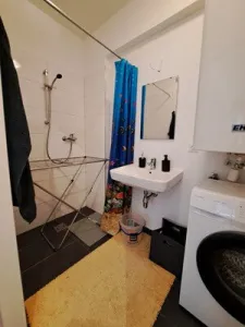 Raumaufteilung Wohnung 1 mit 45,06 m² Wohnfläche, ca. 6 m² Terrasse und ca. 44 m² Grünfläche: Vorraum, Badezimmer mit Dusche und WC, Schlafzimmer, Wohnküche mit Zugang zur Terrasse und Grünfläche.