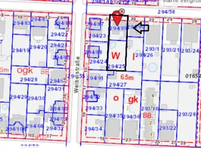 Widmung: W I / 6,5 m höhenbeschränkt / offene oder gekuppelte Bauweise + BB6: Auf den mit BB6 bezeichneten Flächen darf die bebaute Grundfläche von Hauptgebäuden höchstens jeweils 250 m² betragen. Bauplätze, die ein Flächenausmaß von 1.500 m² überschreiten, dürfen im Ausmaß von höchstens 25 % be-baut werden.