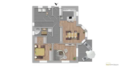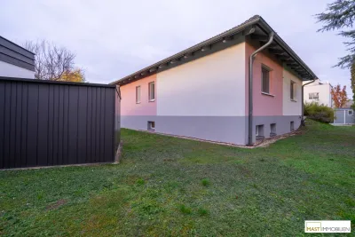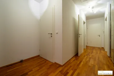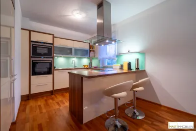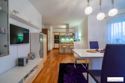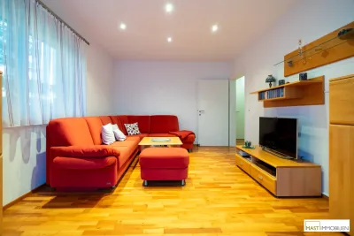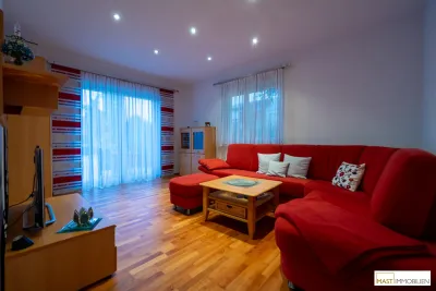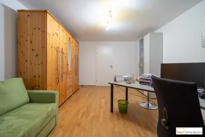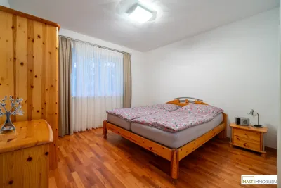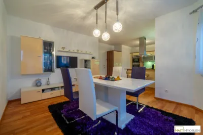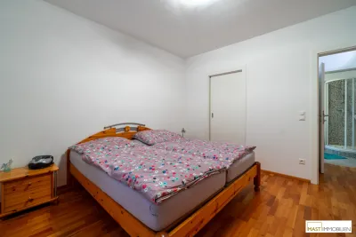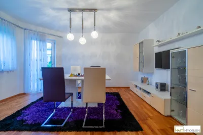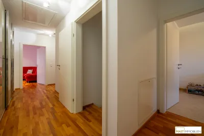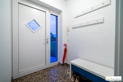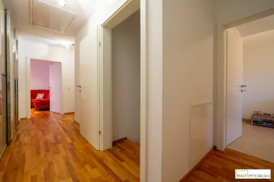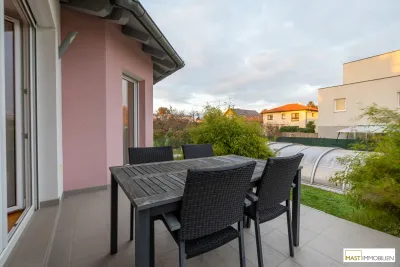 Nach Eintritt in das Haus gelangen Sie in ein Vorraum im Ausmaß von ca. 3 m² für Ihre Garderobe. Sämtliche Räume sind vom Vorzimmer aus, separat begehbar und bieten daher absoluten Komfort. Die bereits verbaute Einbauküche wurde mit hochwertigen Geräten der Firma SIEMENS & MIELE veredelt und sind im Kaufpreis inkludiert. Aktuell wird die große Wohnküche (ca. 28 m²) als Wohn- bzw. Speisezimmer genutzt. Neben der Küche gibt es ein Zimmer im Ausmaß von ca. 17,40 m² mit direkten Zugang auf die ca. 13 m² große Terrasse in südöstlicher Ausrichtung. Das Schlafzimmer verfügt über eine Fläche von ca. 13,10 m² und einen vom Schlafzimmer begehbaren Schrankraum mit ca. 3,40 m².