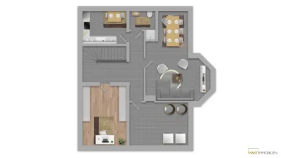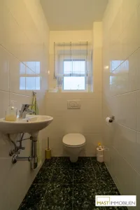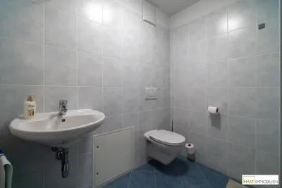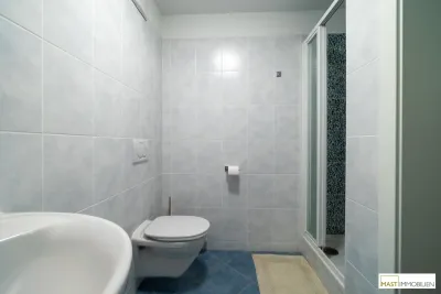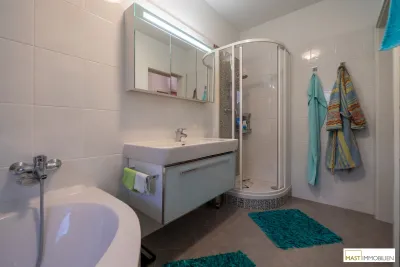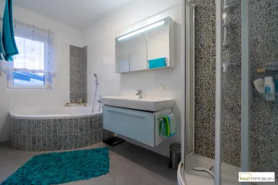 Das modern gestaltete Badezimmer wurde mit einer Eckbadewanne, Dusche & Waschbecken ausgestattet. Die Waschmaschine befindet sich im Hauswirtschaftsraum das sich ebenfalls im Erdgeschoss befindet und ist ca. 7 m² groß.