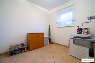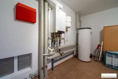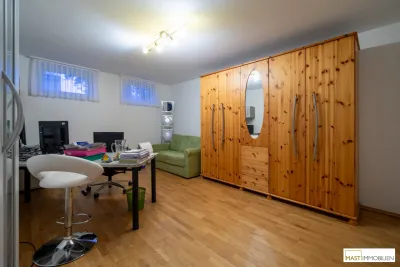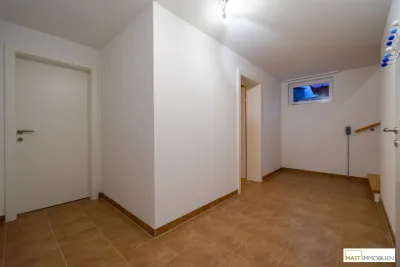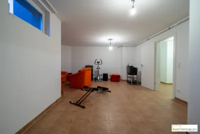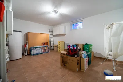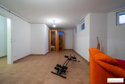 Das Kellergeschoss dass zur Gänze voll bewohnbar wäre wurde flächendeckend mit einer Fußbodenheizung ausgestattet. Der Vorraum mit ca. 18 m² bietet ebenfalls wie im Obergeschoss Zugang in sämtliche Räumlichkeiten. Aktuell wird ein Zimmer als Büro genutzt und ist ca. 18,30 m² groß. Raum II ist knapp 30 m² groß und verfügt über eine Sauna/Infrarotkabine. Der Technikraum bietet ausreichend viel Stauraum und verfüg über eine Fläche von ca. 17,50 m². Selbst eine zur Gänze verbaute Küche inkl. funktionstüchtiger Geräte befindet sich im Kellergeschoss und hat eine Fläche von ca. 10 m². Daneben befindet sich ein Bad mit Dusche, WC und Waschbecken.