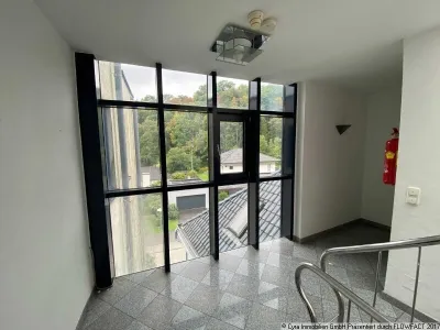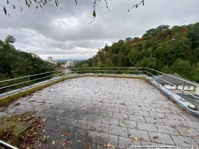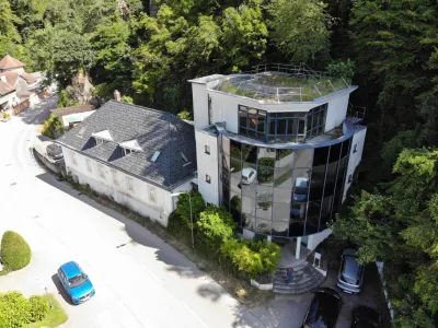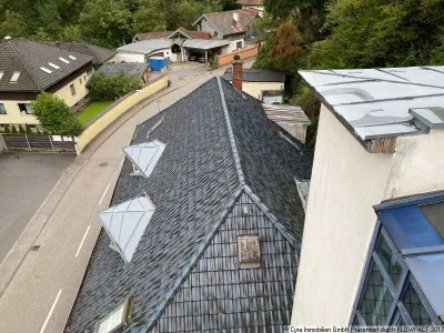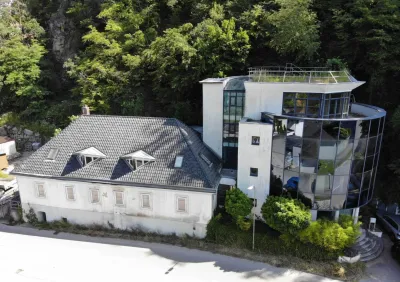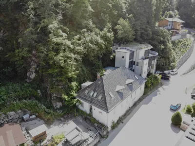 Im Neubau befindet sich ein Personenlift und eine schöne Dachterrasse. Hinter dem Objekt steigt das Gelände steil nach oben und ist bewaldet.
