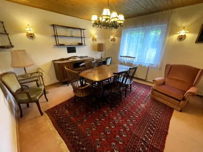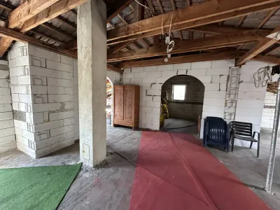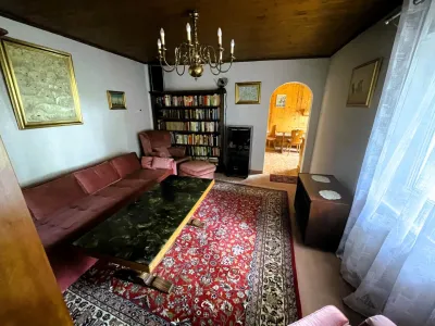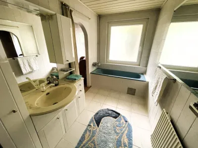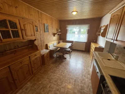 ERDGESCHOSS: Windfang, großer Vorraum, Küche mit Essplatz, Wohnzimmer, Esszimmer, Schlafzimmer, Kinderzimmer, Bad mit Wanne und Dusche, WC;