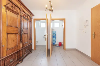 Das Erdgeschoss des Hauses beherbergt das Büro, das sich ideal für eine Home-Office-Nutzung eignet oder als zusätzlicher Raum für gewerbliche Zwecke genutzt werden kann. Die Lagermöglichkeiten bieten ausreichend Platz für die Aufbewahrung von Gegenständen oder können zu zusätzlichen Arbeitsbereichen umgestaltet werden. Alternativ bieten diese auch KFZ-Stellplätze für mindestens drei Autos.