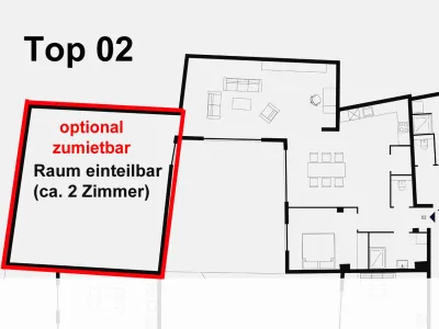 Optional kann die Wohnung später um 50m² vergrößert werden, um die Wohnung beispielsweise um ein Homeoffice, ein weiteres Badezimmer und bis zu 2 Schlafzimmer zu erweitern.