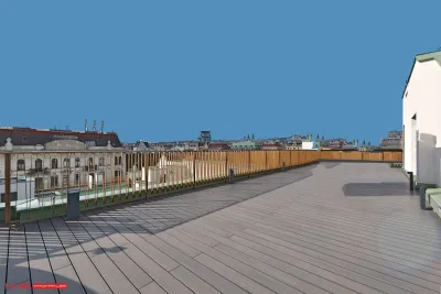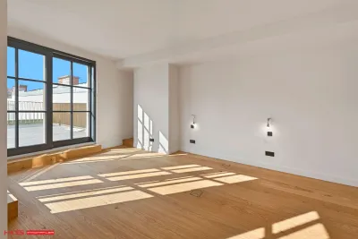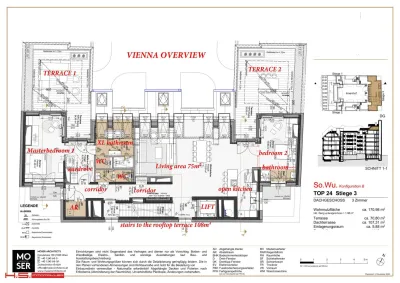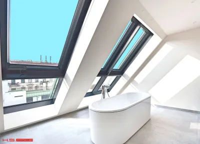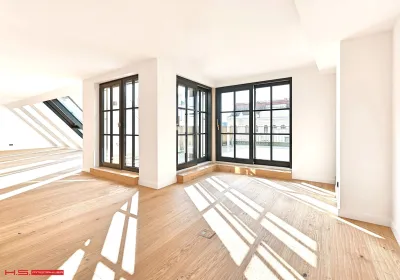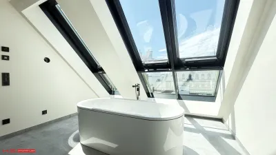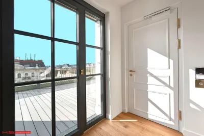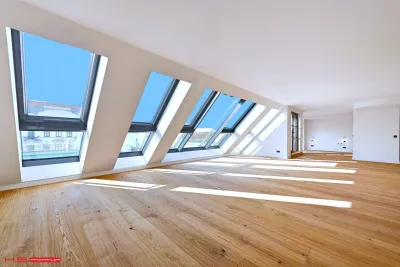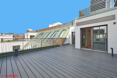 - Es wurde auf 1 Wohnebene errichtet und verfügt über 171 qm Wohnfläche sowie 3 Terrassen im Ausmaß von insgesamt ca. 178 qm – zwei davon auf der Wohnebene und eine grandiose Dachterrasse mit Blick über den Naschmarkt.