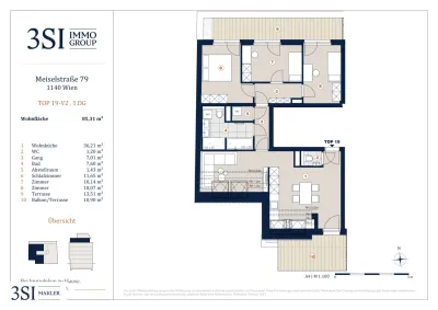 Diese moderne und hochwertige 3-Zimmer Dachgeschoßwohnung verfügt über ca. 86 m² Wohnfläche zzgl. einer straßen- und einer hofseitigen Terrasse. Sie besticht durch ihren durchdachten, Grundriss und teilt sich wie folgt auf: