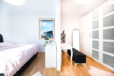 Im Obergeschoß sind ein Schlafzimmer mit begehbarer Garderobe, zwei weitere Schlafzimmer inkl. Balkon, und ein großes Badezimmer mit Fenster, Toilette, Dusche und Badewanne.