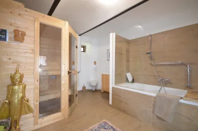 In hinteren Teil des Dreikanthofes ist ein Wellnessbereich eingerichtet mit Sauna und Dusche, WC, daneben gibt´s noch einen Weinkeller.