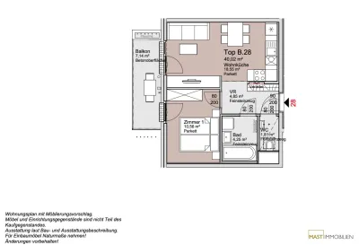 Die Wohnung befindet sich im 4. Liftstock und verfügt über 40,02 m² Wohnfläche + einen 7,14 m² großen Balkon.