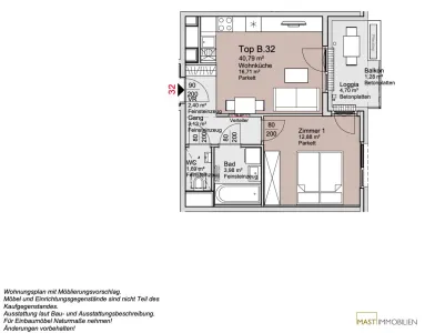Die Wohnung befindet sich im 4. Liftstock und verfügt über 40,79 m² Wohnfläche + eine 5,98 m² große Freiflächen.