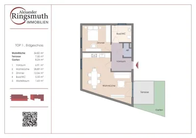 - Top 1: EG; 2 Zimmer; Wohnfläche: ca. 54,82m²; Garten + Terrasse: ca. 15,74m²; 299.000,-- Euro