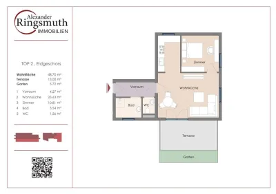 - Top 2: EG: 2 Zimmer; Wohnfläche: ca. 48,70m²; Garten + Terrasse: ca. 18,72m²; 279.000,-- Euro