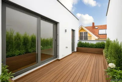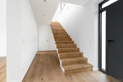 Die hochwertige Ausstattung überzeugt u.a. mit edlem Dielen-Eichenparkett, geschmackvollen Feinsteinzeugfliesen, Markenkeramiken- und Armaturen u.a. von LAUFEN und HANSGROHE und Alu-Fenster- und Fenstertüren (3-Scheiben Isolierverglasung) mit außenliegenden Raffstores. Eine Luftwärmepumpe sorgt für eine nachhaltige Wärme- und Warmwasserversorgung. Vorbereitungen für eine Photovoltaikanlage am Dach eine Klimaanlage und eine E-Ladestation (KFZ-Stellplatz) werden ebenfalls getroffen.