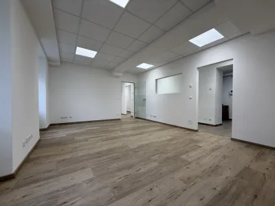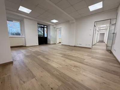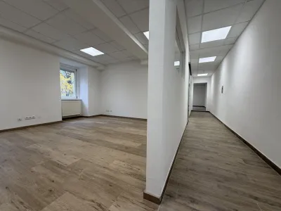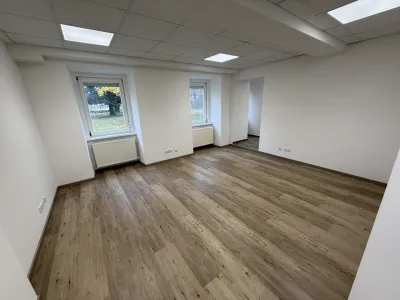 Ebenerdig begehbares BÜRO mit RUND 110m² und TERRASSE / zentraler Vorraum + 3 Büros (ca. 27m², 21m² und 20m²) + Platz für z.B. eine Küche (ca. 13m², Anschlüsse vorhanden) + 2 WC´s + ca. 10m² TERRASSE / das Büro ist überwiegend mit PARKETTBODEN ausgestattet, verfügt generell über eine angenehme Atmosphäre und ist SEHR HELL bzw. Richtung SÜD-Ost orientiert / ZWEI Kfz-Abstellplätze sind in der Miete bereits INKLUDIERT.