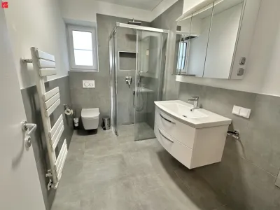 Das Badezimmer ist mit einem modernen Design ausgestattet und verfügt über ein Fenster, welches für ausreichend Tageslicht sorgt und eine gute Durchlüftung gewährleistet. Die großzügige Dusche bietet Ihnen einen perfekten Start in den Tag und lässt Sie entspannt in den Abend gehen. Die dreifachverglasten Fenster verfügen nicht nur über ein Insektengitter sondern darüber hinaus auch eine elektrische Rollo für eine optimale Beschattung.