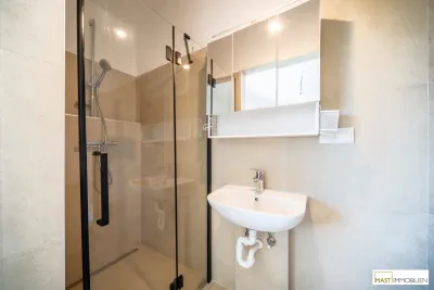 - hochwertige großformatige Fliesen im Sanitärbereich und moderne Duschen mit schwarzen Details