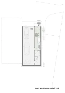 Im Untergeschoss (ebenerdiger Zugang) befindet sich neben dem Eingangsbereich ein großzügiger Garderobenbereich, die Garage (mit Platz für 2 PKW und Fahrräder), sowie ein Technik- und Hauswirtschaftsraum – mit Anschlussmöglichkeiten für Waschmaschine und Wäschetrockner.