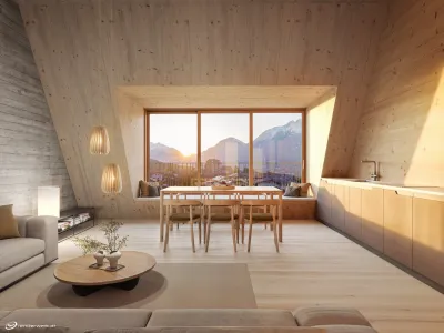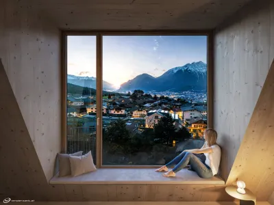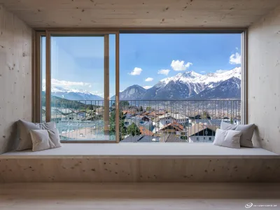 Im Obergeschoß befinden sich zwei weitere helle Schlafzimmer mit großzügigem Balkon Richtung Süd-Osten, ein angrenzendes, elegantes Badezimmer mit Badewanne, Dusche und WC. Phantastisch ist der 3,5m hohe Wohn-, Koch- und Essbereich mit herrlich großer Fensterfläche und Blick über Innsbruck und auf die Nordkette! Das Fenster-Element ist komplett aufklappbar, die überbreite Fensterbank mit Sitzgelegenheit garantiert gemütliche Weitblickstunden!