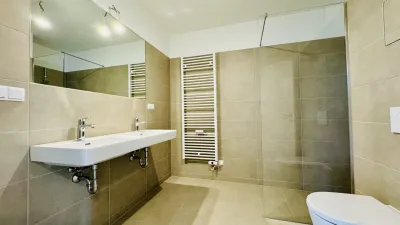 Im Vorraum angekommen, gelangen Sie rechterhand in das WC mit Handwaschbecken sowie Abstellraum. Weiters gelangen Sie rechterhand ins Bad mit Dusche, Doppelwaschbecken und WC.