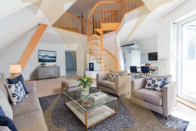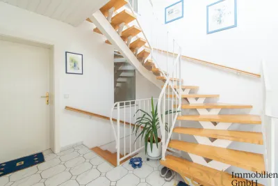 Über eine elegante Treppe im Vorhaus gelangen Sie in das großzügige Obergeschoss mit knapp 172 m², das drei weitere Schlafzimmer, ein Badezimmer im zeitlosen Design, ein WC, eine Garderobe, zwei Abstellräume sowie einen sehr großzügigen Wohn- und Essbereich mit Küche umfasst. Von hier führt eine hölzerne Wendeltreppe weiter zur geräumigen Galerie im Dachgeschoss mit etwa 23 m², die vielseitig nutzbar ist.