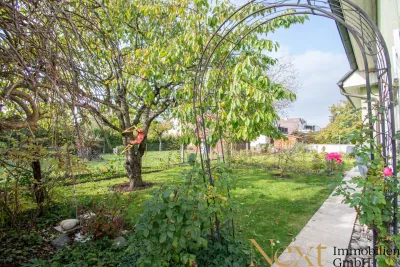 Vom offenen Essbereich und dem Wohnzimmer aus gelangt man direkt auf die nach Süden ausgerichtete Terrasse und in den traumhaften Garten, der mit seinen Baum- und Strauchlandschaften ein Gefühl von Urlaub aufkommen lässt. Dieses grüne Paradies, das über einen separaten Zugang erreichbar ist, verfügt außerdem über einen liebevoll angelegten Obst- und Gemüsegarten samt Geräteschuppen. Der großzügige Pool und das gemütliche Gartenhaus verwandeln den Garten in eine Wohlfühloase und laden zu entspannten Stunden im Freien ein.