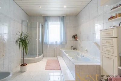 Das große Badezimmer im Erdgeschoss beeindruckt mit edlen Marmorfliesen und ist neben einer Dusche und Badewanne sogar mit einem Bidet ausgestattet. Ein zusätzliches, separates WC ergänzt den Komfort auf dieser Ebene. Ebenfalls im Erdgeschoss befinden sich ein Schlafzimmer, ein Büro sowie ein Gästezimmer mit eigenem Bad – alle Räume sind vom Vorraum aus zugänglich und hell und freundlich gestaltet.