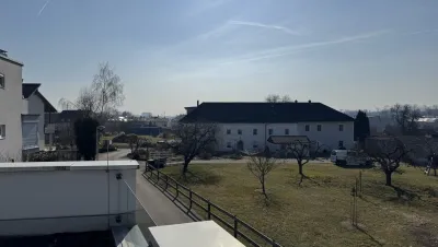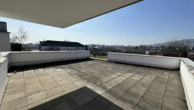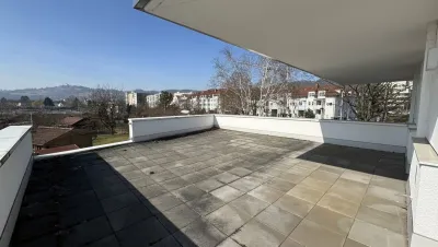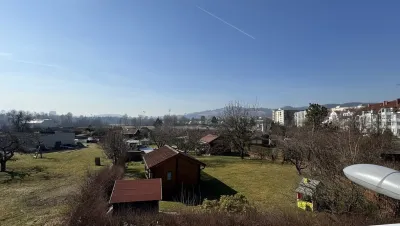 Genießen Sie den atemberaubenden Ausblick auf die Stadt und die umliegende grüne Landschaft von gleich zwei großzügigen Terrassen. Diese sind perfekt, um entspannte Stunden im Freien zu verbringen, sei es für einen Kaffee am Morgen oder ein gemütliches Beisammensein mit Freunden am Abend.