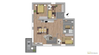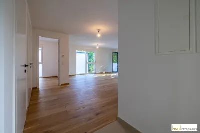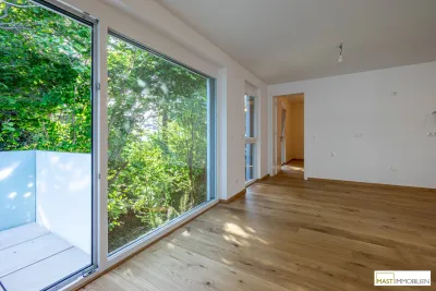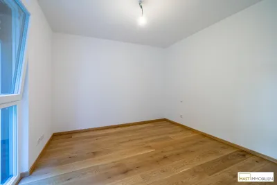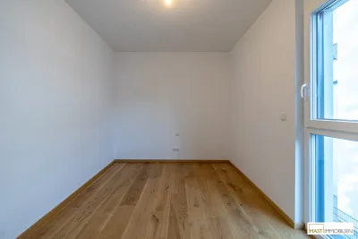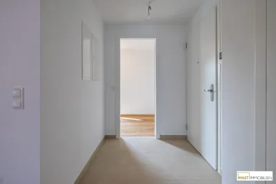 Nach Eintritt in die Wohnung gelangen Sie in ein ca. 2,50 m² großes Vorzimmer. Das modern gestaltete Badezimmer mit Dusche, das separat WC inkl. Handwaschbecken und die Wohnküche sind direkt vom Vorraum aus begehbar. Die Wohnküche wurde zur Gänze mit einem hochwertigen Eichenparkett in Langdiele veredelt und verfügt über eine Fläche von ca. 38 m². Der Zugang auf den ca. 6,50 m² Balkon in südwestlicher Ausrichtung ist ebenfalls von der Wohnküche aus begehbar. Das Elternschlafzimmer bietet eine Fläche von ca. 11,70 m² und bietet zahlreiche Stellmöglichkeiten für Bett & Schrank. Das Kinderzimmer befindet sich neben dem Vorraum und ist knapp 11 m² groß.