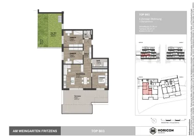 Die Wohnung Top B03 im 1. OG ist eine smart geplante 4-Zi.-Wohnung und bietet großzügigen Wohnraum, eine große Terrasse und einen eigenen Gartenbereich – ideal für Familien oder Paare, die stilvolles Wohnen in ruhiger Umgebung suchen.