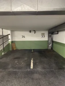 Die Garage liegt im Untergeschoß eines 1974 errichteten Mehrfamilienhauses mit glatter Fassade und Personenaufzug.