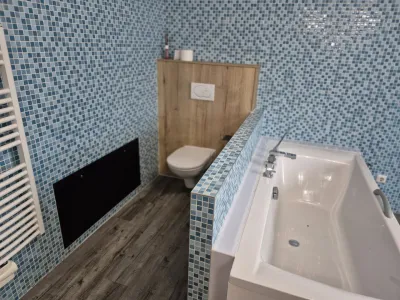 # riesiges Badezimmer mit Badewanne und separater Dusche und WC im Obergeschoß