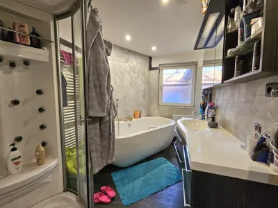 Weiters erreichen von hier aus das tageslichthelle Badezimmer, mit Badewanne und Dusche. Ein Gäste-WC ist ebenfalls vorhanden. Der Bungalow verfügt des Weiteren über zwei separate Schlafzimmer, welche über einen Abstellraum bzw. Ankleideraum erreicht werden können sowie zwei Carportstellplätze.