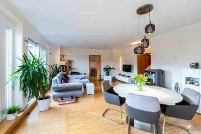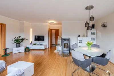 Die Wohnfläche von ca. 123m² bietet neben 3 Schlafzimmern auch Platz für ein wunderschönes großzügiges Wohnzimmer, die separierte und doch integrierte hochwertige Küche, sowie ein separates WC, ein großzügiges Badezimmer mit Wanne, Dusche und Toilette. Es ist auch Raum für Abstellmöglichkeiten und Technik vorhanden.