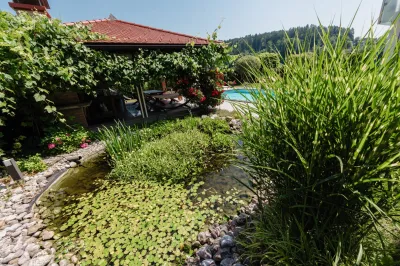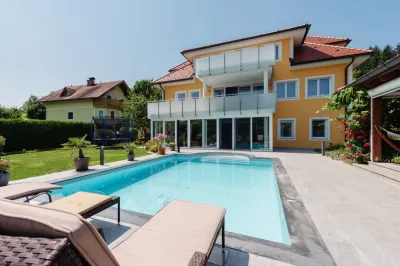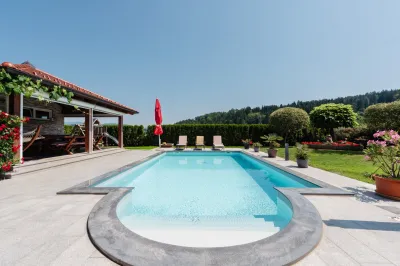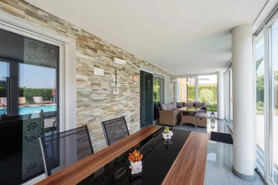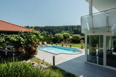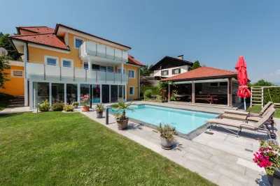 Die Außenanlage mit Salzwasser-Pool, Terrassen, Liegeflächen und großem Pavillon mit Außenküche ist sehr ansprechend gestaltet und lädt zum Genießen und Relaxen ein.