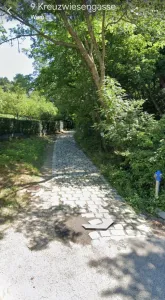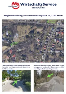 Komfortable Zufahrt: Die Zufahrt direkt bis zum Haus mit Garage ist möglich. Fahren Sie von der Dornbacher Straße bei der Apotheke Neuwaldegg in die Klampfelberggasse und weiter in die Kreuzwiesengasse. Vor der Kirche rechts abbiegen auf einen gepflasterten, parkähnlichen Weg. So gelangen Sie bequem direkt zum Haus.