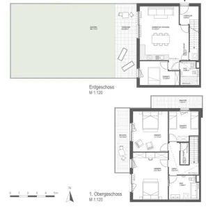 Die offene Wohnküche mit Zugang zur Terrasse bildet den Mittelpunkt des Hauses. Große Fensterfronten sorgen für Helligkeit und ein freundliches Ambiente. Mit insgesamt 5 Zimmern und 2 Badezimmern eignet sich die Wohnung sowohl für Familien als auch für Paare, die ein repräsentatives Zuhause mit Rückzugsmöglichkeiten suchen.