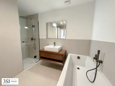 - Badezimmer mit Badewanne, Dusche und Waschmaschinenanschluss