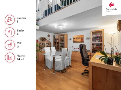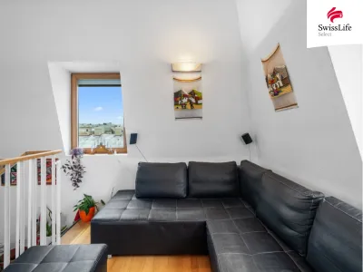 Ein besonderes Highlight ist die lichtdurchflutete Galerie, die vom Esszimmer aus über eine Treppe erreicht wird. Die Galerie wird derzeit als Wohnzimmer genutzt und ermöglicht einen tollen Ausblick auf den belebten Meidlinger Markt und auf das bunte Stadttreiben.