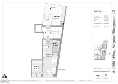 Auf ca. 44,33 m² Wohnfläche plus 19,42 m² Außenfläche finden sich folgende Räumlichkeiten: