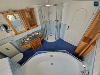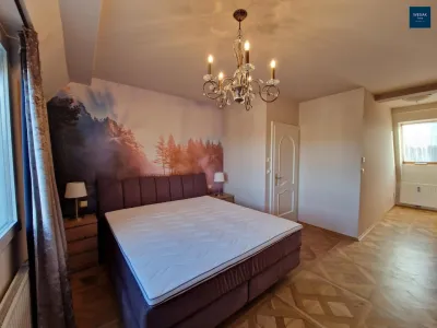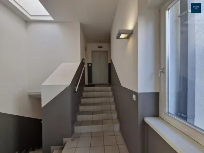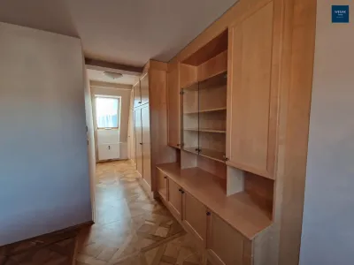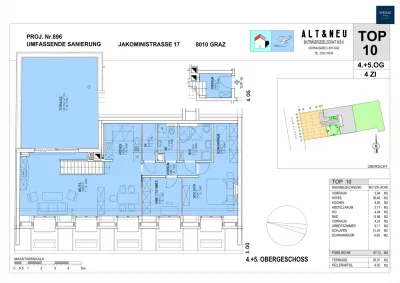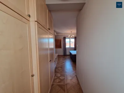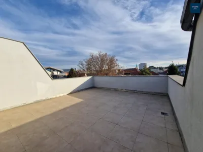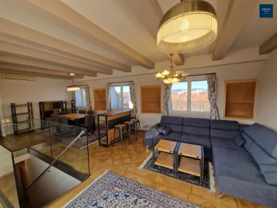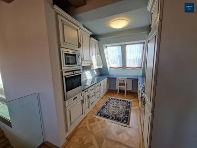 Die Wohnung befindet sich im 4. Obergeschoss (Lift ist im Haus vorhanden) und unterteilt sich in zwei Etagen. Im unteren Bereich befinden sich ein Vorraum. In der obersten Etage befinden sich ein Badezimmer mit Eckbadewanne, Dusche und ein Bidet, ein separates WC, Abstellraum, Schrankraum, geräumige Küche mit einem Wohn-Essbereich, ein Arbeitszimmer, ein Schlafzimmer sowie der Wohnbereich mit Zugang auf die circa 40 m² Terrasse. Die Küche ist eingerichtet und mit Geräten ausgestattet. Für extra Stauraum ist der Wohnung ein Kellerabteil zugeordnet. Ein Carpot ist in der Miete auch inkludiert. Die Wohnung wird teilmöbliert vermietet.