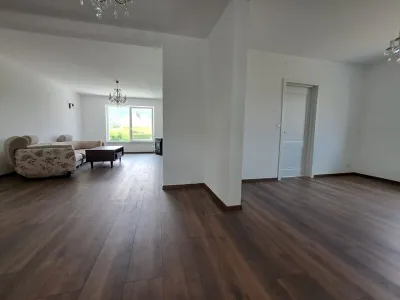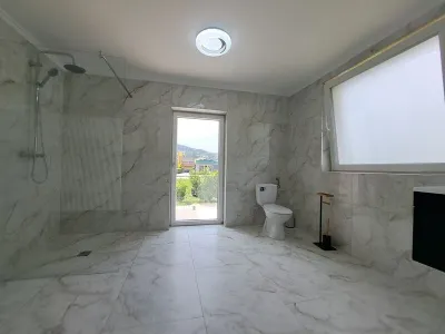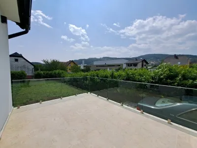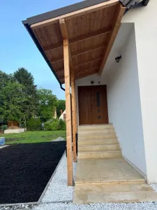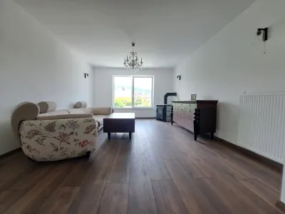Erdgeschoss: Vorraum, Gäste-WC, Wohnzimmer, Küche-Esszimmer mit Zugang zur südseitigen Sonnenterrasse, offenes Zimmer, großes Badezimmer mit Dusche und WC und Zugang zur westseitigen, kleineren Terrasse