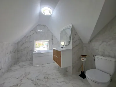 Dachgeschoss: Vorraum, Badezimmer mit Badewanne und WC, Leseecke, 2 Schlafzimmer