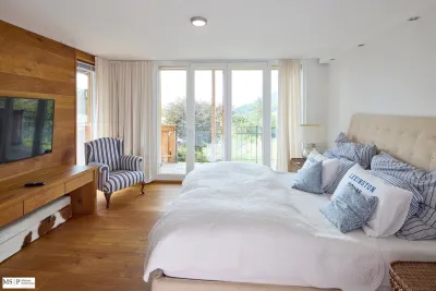 Im Erdgeschoß mit ca. 131 m² befindet sich ein großes Schlafzimmer mit en-suite Bad und Ankleide, eine weiße Design-Einbauküche mit modernen Markengeräten, ein Gäste-WC, Abstellfläche und Einbauten für praktischen Stauraum sowie ein großer Wohnraum mit ca. 45 m², offenem Kamin und Zugang auf den Balkon - Kaiser-Blick inklusive! Der Wohnbereich ließe sich auf Wunsch in 2 weitere Schlafzimmer unterteilen und könnte ebenso als separate Einheit mit eigenem Eingang verwendet werden.