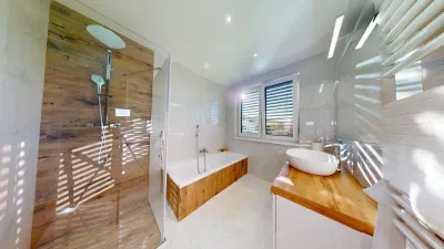 - ein Badezimmer mit Badewanne und Walk-In Dusche, Armaturen der Marke Hansgrohe